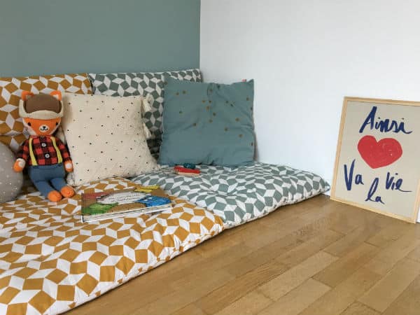 Côté linge de lit, nous avons choisi deux parures en coton bio de Nobodinoz, deux draps housse chez Ptits Basile et un protège-matelas Éveil & Nature via Greenwez. La couette et l’oreiller viennent de Sevira.Kids, une marque que l’on a découverte un peu par hasard mais qui s’est révélée très fiable.